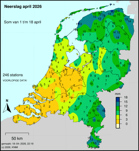 Aan de voorzijde van een koufront werd het in het midden en oosten van het land nog 18 tot 20 graden. Het koufront zorgde in het westen voor een enkele buitje, maar verder landinwaarts, in de warmere lucht viel toch nog zo’n 5 mm. In de middag klaarde het vanuit het westen flink op, daar was het toen een graad of 13. De wind was zwak tot matig vanuit het westen.